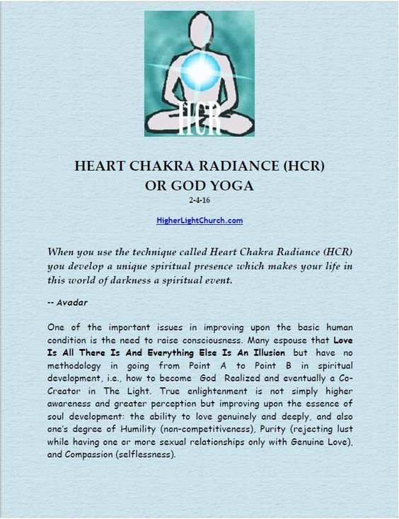 OF CONSCIOUSNESS. The ideals were stated but without the methodology. Heart Chakra Radiance (HCR) is the methodology! "...the human body, free from the vaccine toxins, is transformed through a cosmic energy burst, one that invigorates every human with new life, vitality and youthfulness, as well as higher-dimensional abilities