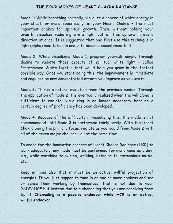 Visualize a white sphere in your heart or heart chakra that is radiating spiritual white light in all directions at once. At the same time, with the intake of each breath, visualize drawing in energy as you